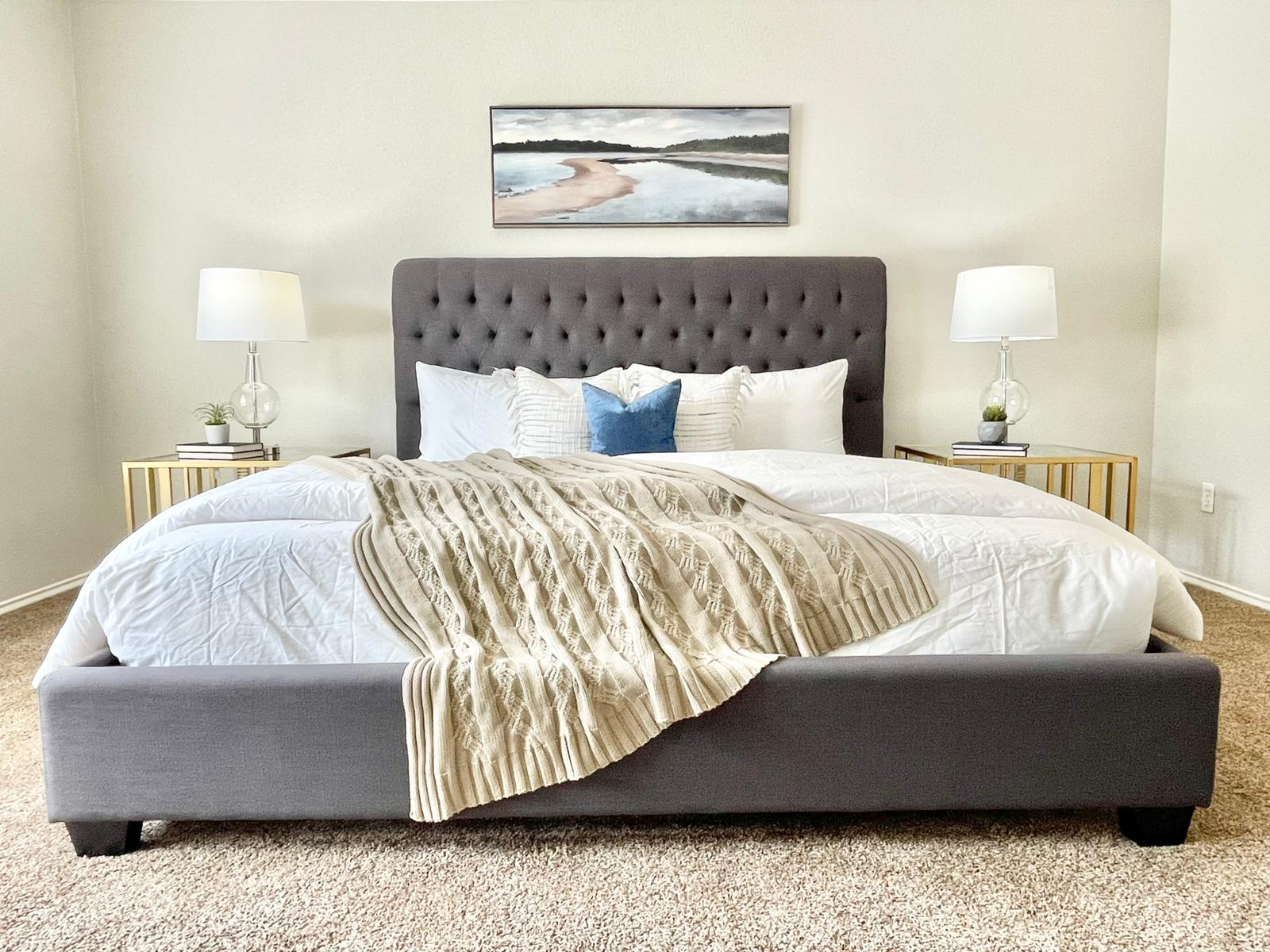 The crisp and updated kitchen opens to the living area and dining areas, and comes equipped with stainless steel appliances and updated lighting.
